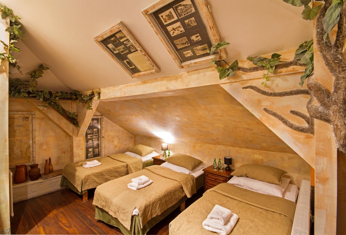 Rzeźbione winorośla oplatające ściany sprawiają wrażenie niemalże prawdziwych. Pokój zdecydowanie artystyczny pod względem pomysłu architektonicznego. Jeden z ciekawszych wizualnie pokoi w obiekcie.
